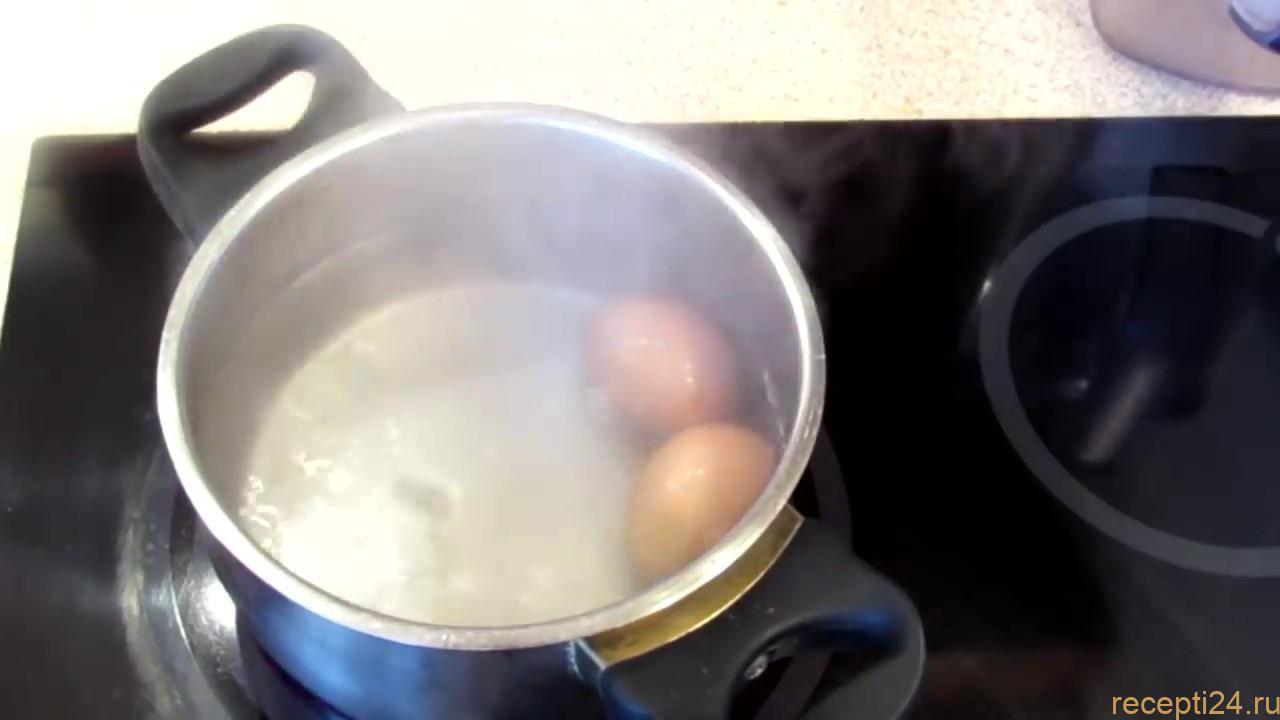 За тем опускаем куриные яйца в кипящую подсоленную воду и варим ровно 1 минуту, что бы желток остался в жидком состоянии, а белок свернулся.