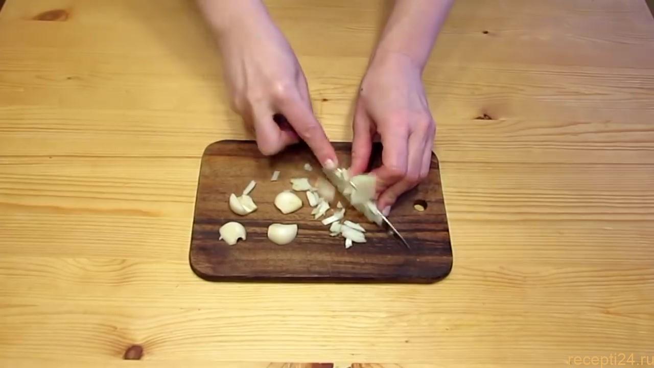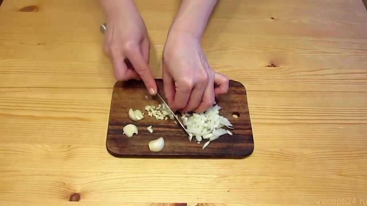 Чеснок так же малко нарезать. Что бы чеснок был менее острым можно его предварительно запечь.