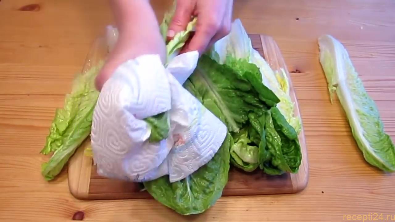 Листья следует промыть в холодной воде и тщательно высушить. Сухие листья салата хранят в холодильнике и не посредственно перед подачей листья должны быть чистыми, сухими и холодными.