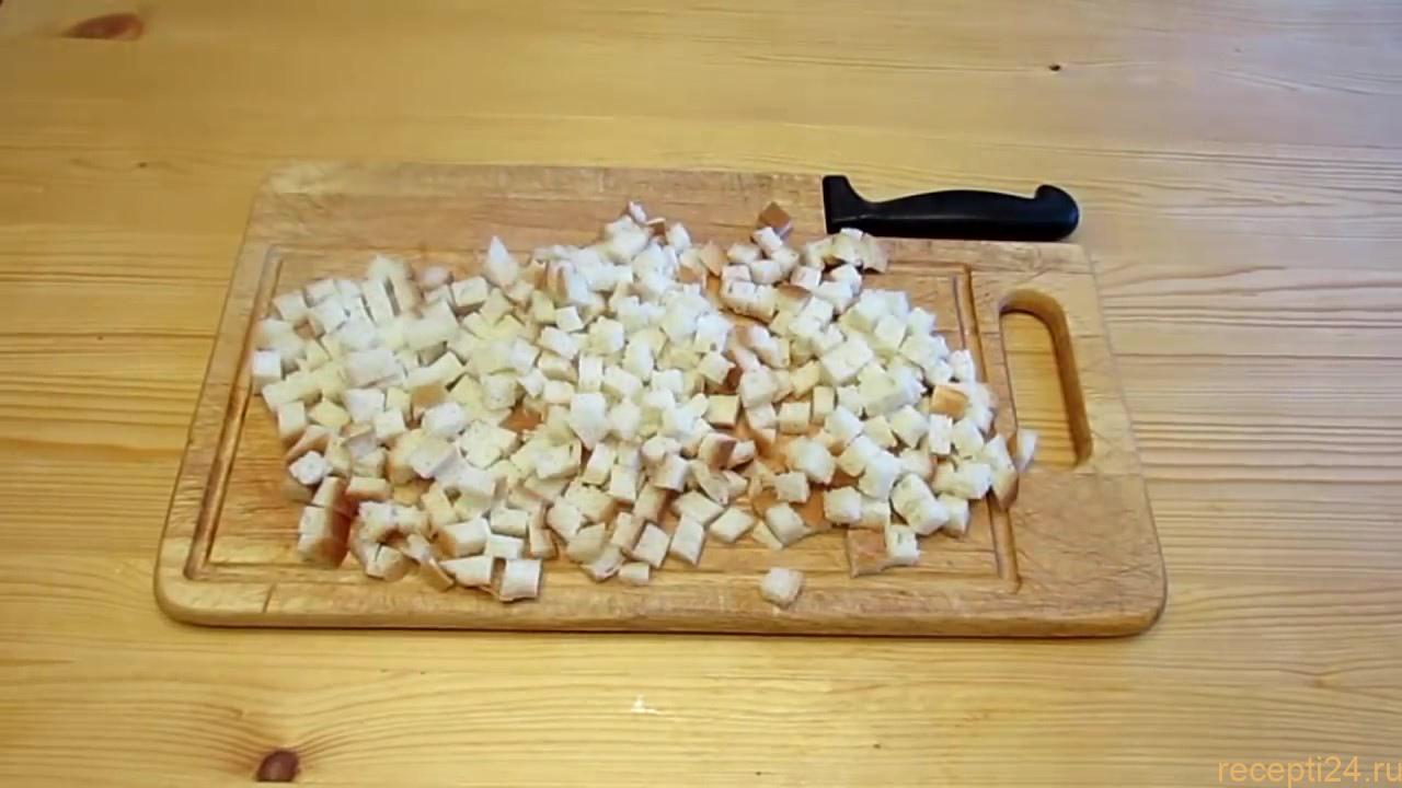 Для приготовления хлебных сухариков нам понадобиться ломтики белого хлеба. Нарезать следует кубиками и размер сухариков можете определить для себя сами, как вам нравиться.