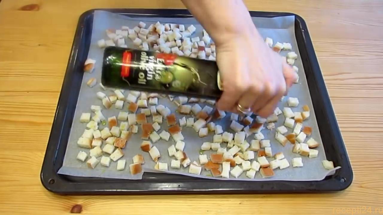 Сухарики можно приготовить на сковороде, но в машем случаи мы делаем в духовке. Сухарики следует полить небольшим количеством оливкового масла и ставим в разогретую духовку при температуре 200-210 с°