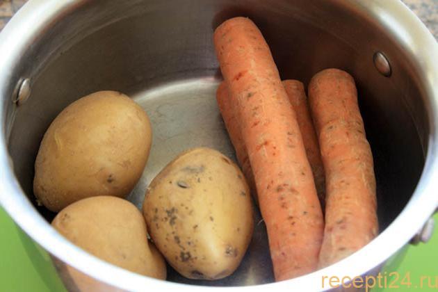 Морковь и картофель моются и варятся «в мундире» 15-25 минут. По окончанию варки, их ставят под холодную проточную воду на несколько минут. Это им поможет не только быстрее остыть, но и лучше будет отделяться кожа.