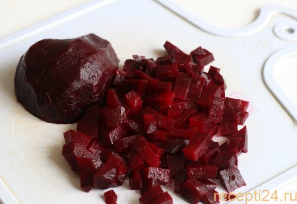 Свекла отваривается до готовности это примерно 1-2 часа. Перед приготовлением ее хорошо моют. От кожи ее не нужно очищать, иначе во время варки она потеряет свой цвет. Снимают кожицу со свеклы после того, как она полностью была приготовлена и успела остыть. Очищенную свеклу нарезают небольшими кубиками.
