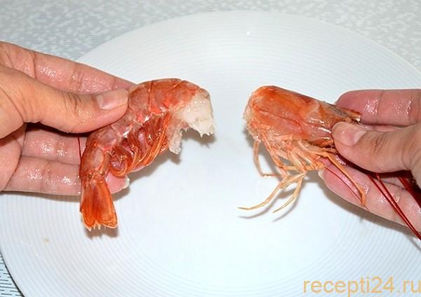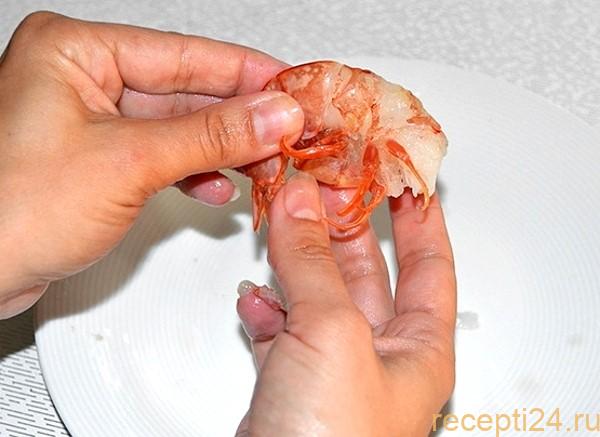 Снимаем панцирь, удаляем конечности. В зависимости от необходимого результата, хвостик можно оставить, или также убрать.