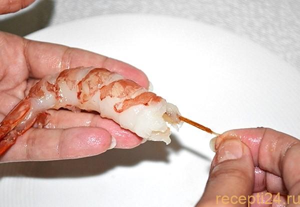 - У чистых креветок нужно вынуть кишечник. Делают это с помощью зубочистки, поддев кишечную вену возле головы под первой пластиной панциря (креветку лучше максимально скрутить в колечко, чтобы панцирь оттопырился).