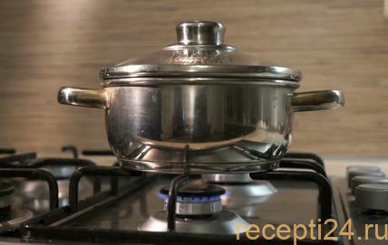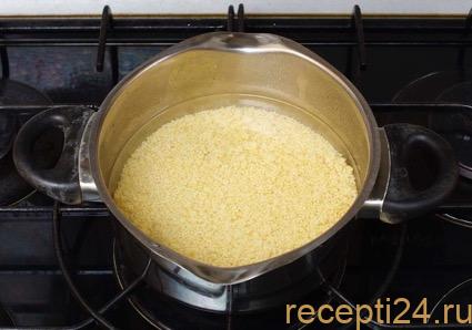 В кастрюлю высыпается крупа, в кипящую воду. После этого огонь сбавляется на минимум.