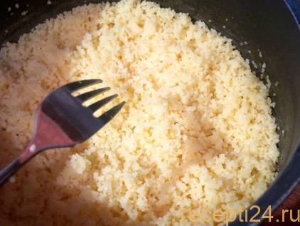 Кус-кус снимается с плиты, подсаливается. В него добавляется масло. Все хорошо перемешивается вилкой.