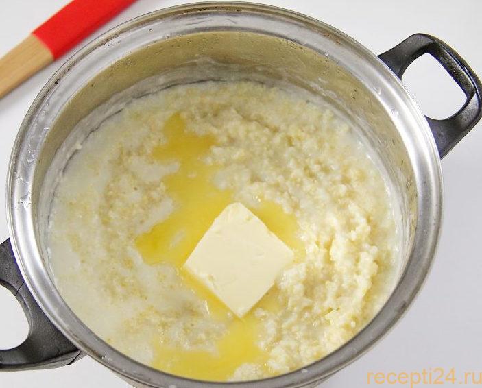По истечении десяти минут, следует выложить на поверхность пшённой крупы ломтики сливочного масла.