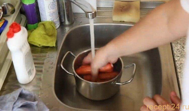 Промойте в воде сардельки
