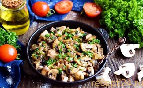 Грибы готовы! Можно подавать к столу, предварительно добавив мелко нарубленную петрушку. Жареные шампиньоны могут быть как самостоятельным блюдом, так и дополнением к гарнирам.