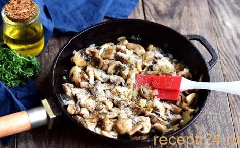 Важно соблюдать очередность загрузки в сковороду ингредиентов, которая указана в данном пошаговом рецепте. Не стоит сразу добавлять к грибам подсолнечное масло, переживая, что без него они подгорят. В шампиньонах содержится большое количество воды. Она начинает выделяться уже спустя несколько секунд после попадания грибов на горячую сковородку. Жидкость не позволит блюду подгореть. Если же долить масло сразу, оно смешается с выделяемой водой, которая после этого не сможет выпариться в достаточном количестве.
