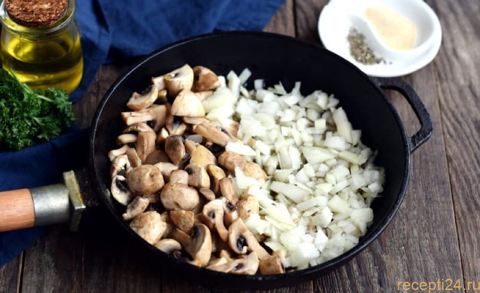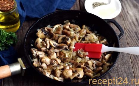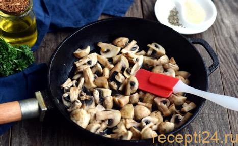 Хорошо разогреть сковороду, чтобы на ней быстро закипала капля воды. Выложить на нее 500 г нарезанных шампиньонов. Масло добавлять не нужно. Накрыть крышкой и на среднем огне дать выйти жидкости из грибов.