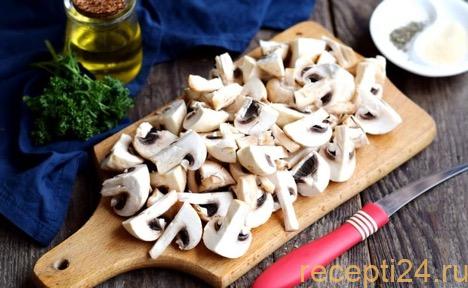 Промыть 500 г шампиньонов. Долго держать грибы в воде не нужно – они сильно впитывают влагу, которая потом будет долго испаряться.