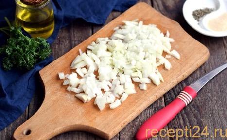 Почистить и порезать 100 г репчатого лука кубиками среднего размера.
