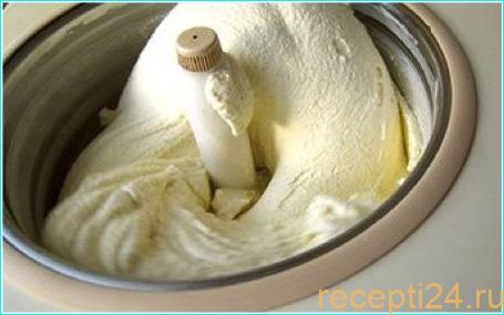 Добавьте ванилин, взбейте полученную смесь по инструкции, прилагаемой к мороженице. В результате должна получится плотная, густая масса кремовой консистенции.