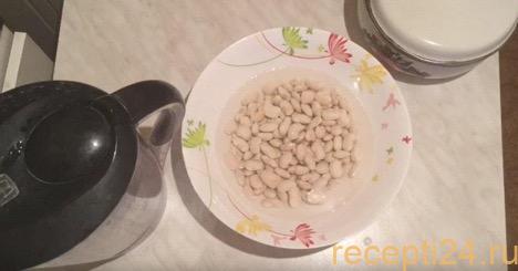 Отсыпьте 200 г белой фасоли. Переберите бобы и засыпьте в глубокую тарелку. Залейте холодной водой, чтобы жидкость покрывала фасолины. Оставьте для набухания на 6-8 часов.