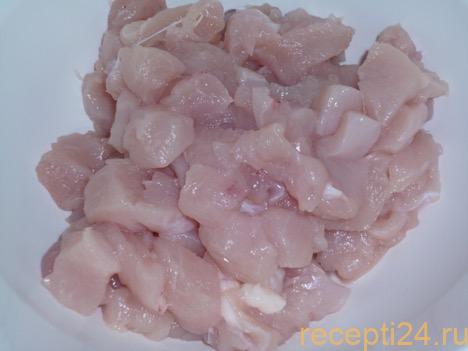 Размороженное мясо промыть водой, нашинковать кубиками и разместить в металлическую кастрюлю для варки.
