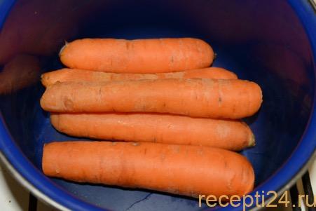 Необходимо сразу подобрать кастрюлю, в которой будет вариться морковь. Это должна быть достаточно широкая емкость, в которую спокойно поместится пять морковок средней длины и полтора литра воды. Именно столько моркови будет достаточно для салата или приготовления порции овощного пюре.