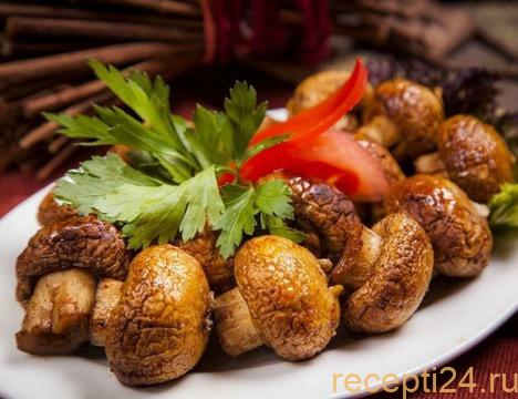 В процессе приготовления стоит поливать грибочки маринадом. Это поможет сделать их еще более ароматными и нежными. Рекомендуем внимательно жарить шампиньоны, чтобы они не подгорали.