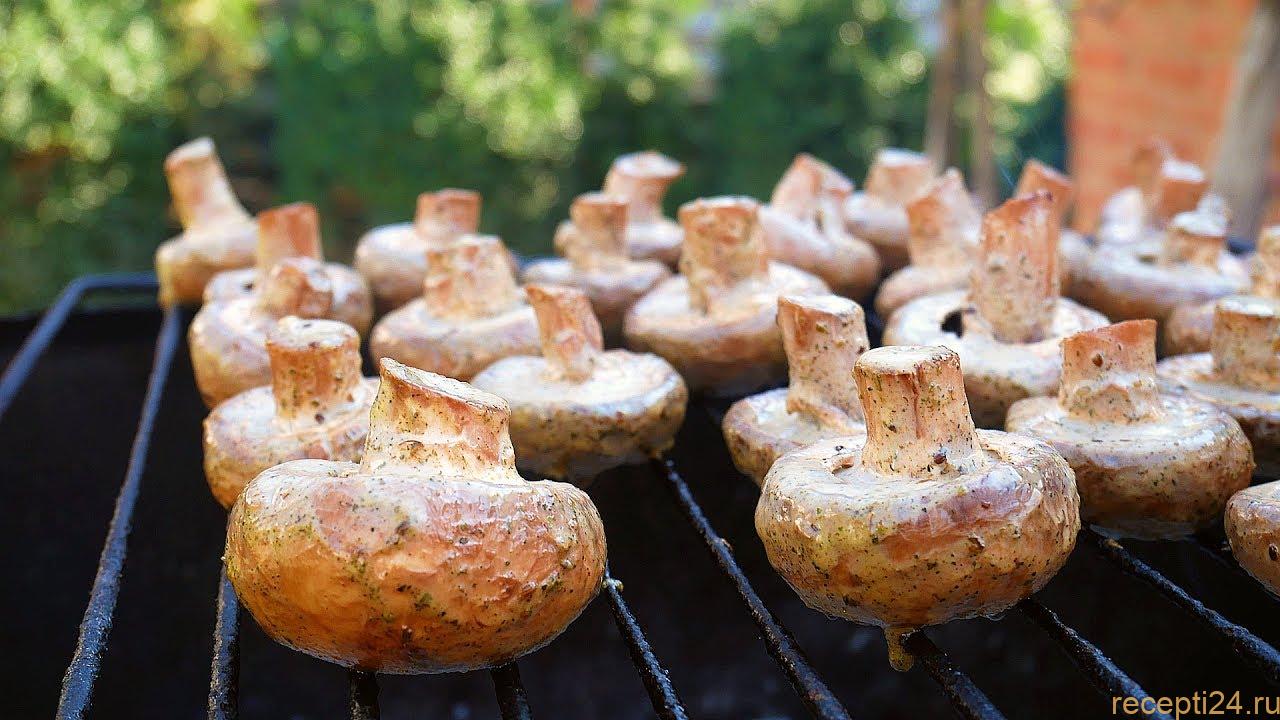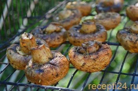 Затем берем шампиньоны и выкладываем их на решетку мангала. Решетку во время приготовления периодически переворачиваем, чтобы грибы хорошо прожарились с двух сторон.