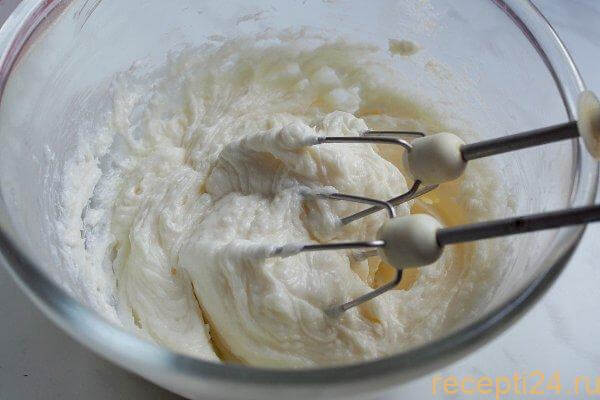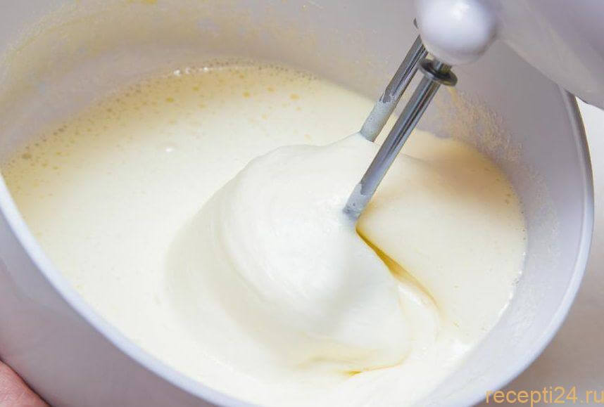 В самом конце добавляем в сливочно-яичную смесь сливки (их взбивать не нужно!) и снова аккуратно все перемешиваем.