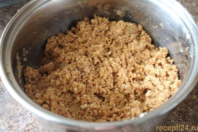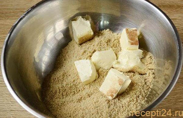 Пока продукты «нагреваются» стоит заняться основой пирога. Для этого используется песочное печенье, которое необходимо измельчить до мелкой крошки. Печенье может быть любым — светлым или темным. Разницы в этом нет и на вкусовые ощущения никак не влияет. Измельчать лучше всего блендером или кухонным комбайном, однако если их в наличии нет, можно просто «проехаться» по печенью скалкой. Главное, чтобы результат измельчения вас полностью удовлетворил.