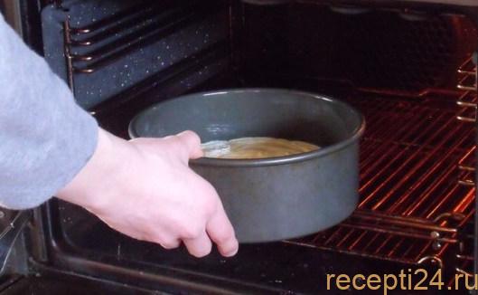 После того, как печенье ровным слоем, толщиной в 1-1,5 см покрыло дно и бока формы, необходимо отправить ее в разогретую духовку максимум на 10 мин. Температура духовки при этом должна быть 180-200 градусов.