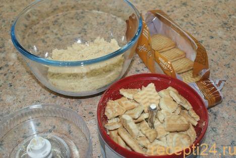 Половину печенья измельчить в блендере. Остальные кусочки ломаем руками. За счет этого можно будет получить интересный рисунок в готовом продукте.