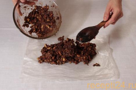 Массу переместить на пищевую пленку. Утрамбуйте, пока не поучится плотный брусок. Обернуть пленкой и убрать в холодильник. Достать спустя 20 минут, придать ему более правильную форму квадрата. После чего снова отправить колбасу на полку холодильника.