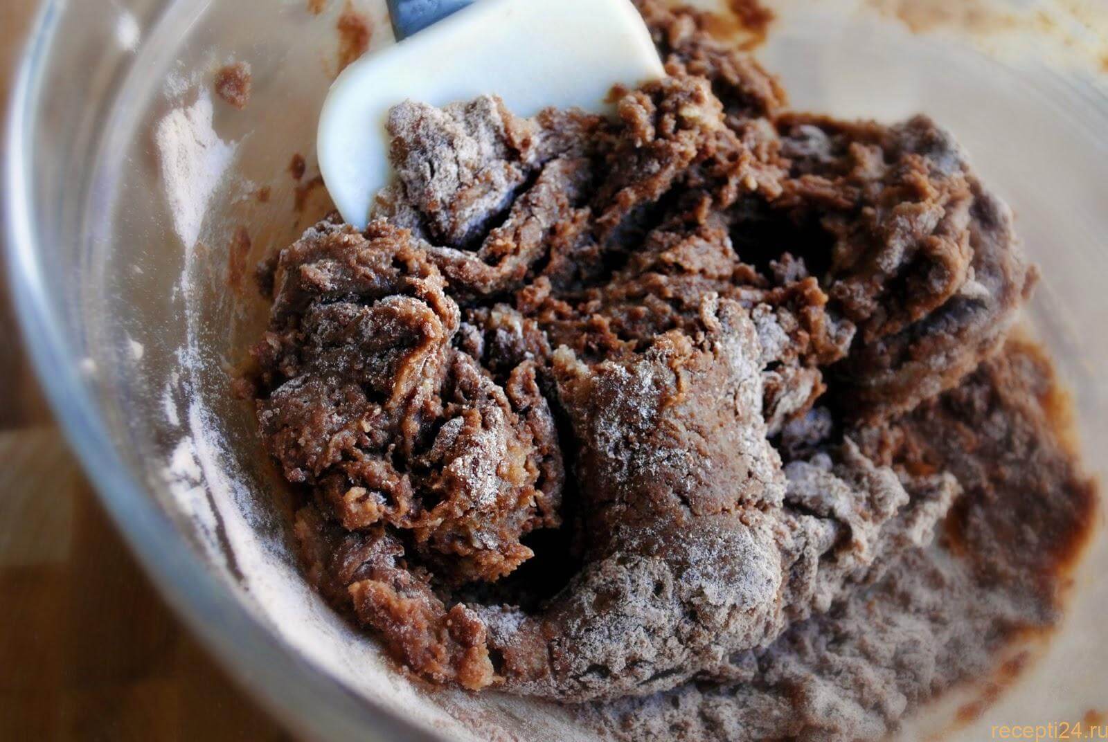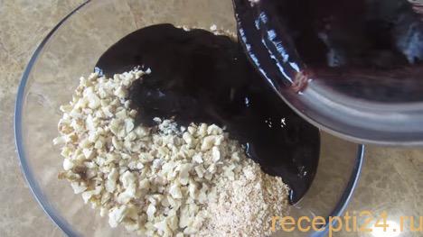 Полученную шоколадную смесь переливаем к печенью. Добавляем нашинкованные орехи и сушеные фрукты.
