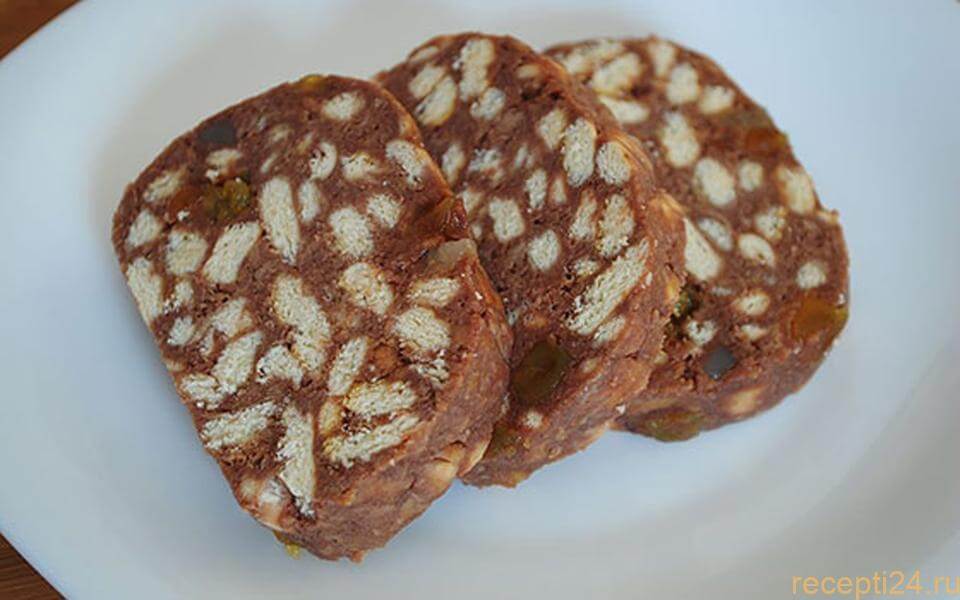 Для приготовления шоколадной колбасы подходит исключительно сладкое печенье. Если случайно купили несладкие крекеры, то количество сахара стоит увеличить.