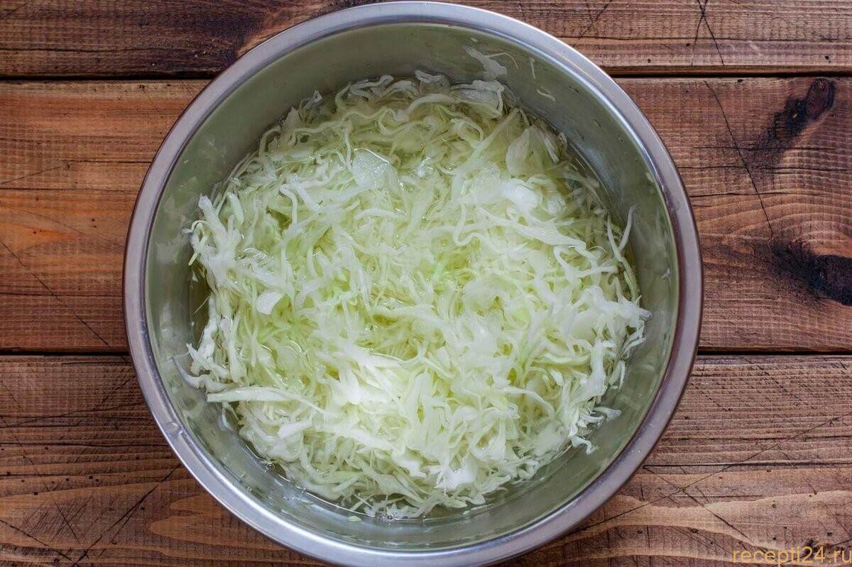 Нашинкованную капусту засыпать солью и хорошо перемять руками. После чего оставить на 10 минут, чтобы она успела пустить сок.