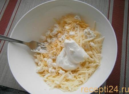 Сначала нужно подготовить все ингредиенты. Яйца стоит заранее достать из холодильника, чтоб они нагрелись до комнатной температуры. Духовую печь тоже нужно включить заранее. Сыр натирают на мелкой терке. Творог можно предварительно помять вилкой или протереть через сито. Это сделает его мягким и нежным. Творог и сыр перемешивают в глубокой миске. Туда же добавляют сметану. Зелень предварительно ополаскивают и мелко нарезают. Затем ее нужно добавить к смеси сыра и творога.