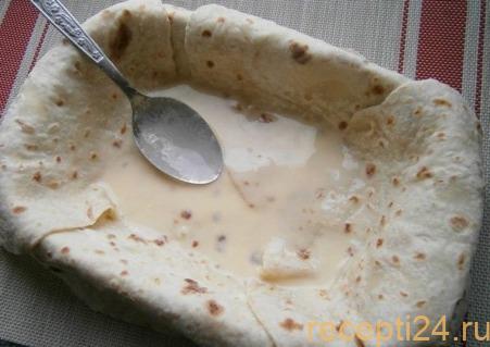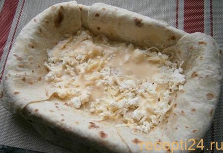 Когда творожно-сырная смесь закончится, края лаваша закрывают внутрь и выливают остаток кефира с яйцами.