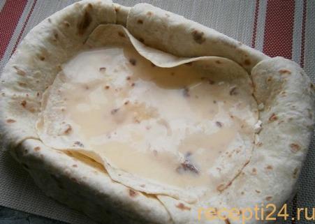 Форму застилают лавашом так, чтоб он покрывал все бортики. Смазывают его заливкой.