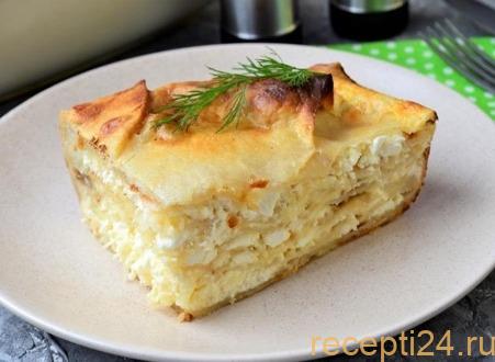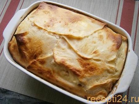 Закрывают это все лавашом. Смазывают кефиром с яйцами, опять выкладывают начинку. Из указанного количества ингредиентов выходит три слоя пирога.