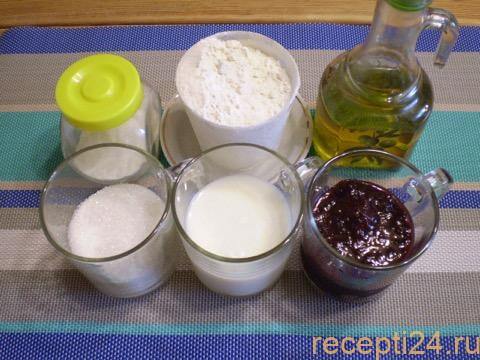 Подготовьте необходимые ингредиенты: варенье, кефир, муку, яйца, соду и масло. Количество лучше отмеривать с помощью кухонных весов, однако если у вас их нет, отмеряйте стаканом из расчёта, что 1 стакан равен 250 г или 250 мл продукта.