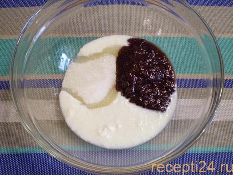 Просейте муку, добавьте к варенью и кефиру 500 г муки, затем несколько раз перемешайте смесь. Доводить её до пышной массы не нужно, достаточно, чтобы ингредиенты соединились. Затем вылейте яично-сахарную смесь, добавьте 50 мл подсолнечного масла и вымешайте тесто. Тесто должно стать густым и начать липнуть к рукам. Проверьте, чтобы сахар полностью растворился.