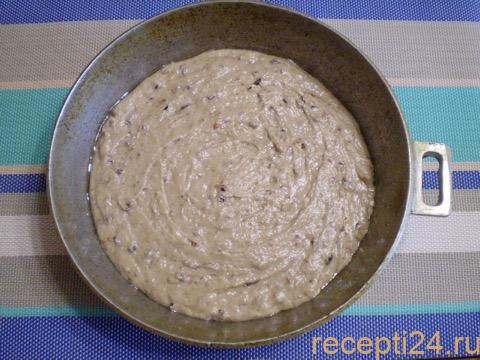 Приготовьте форму для запекания. Воспользоваться можно любой, но лучше всего, чтобы её диаметр был 22-26 см: так корж не будет слишком тонким или слишком толстым. Застелите форму пергаментом или смажьте подсолнечным маслом, чтобы коврижка на кефире с вареньем не пригорела, и её было удобнее доставать. Тесто залейте в форму и выровняйте поверхность силиконовой лопаткой.