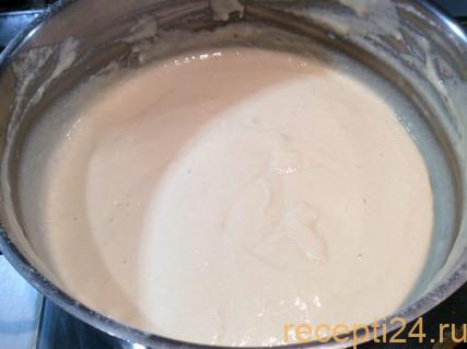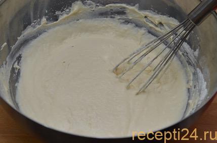В массу высыпается мука с разрыхлителем. Все тщательно перемешивается до тех пор, пока не исчезнут комки. Чтобы процесс был быстрее, это можно делать венчиком.