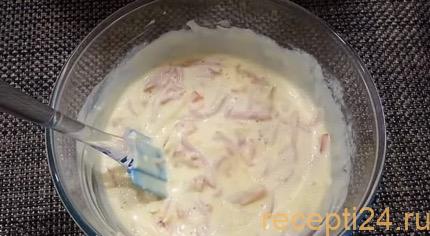 Овощи, колбаса и сыр высыпаются прямо в тесто и перемешиваются. Нужно, чтобы все эти составляющие равномерно были размешаны с тестом. Смесь оставляется под полотенцем настаиваться 10 мин.