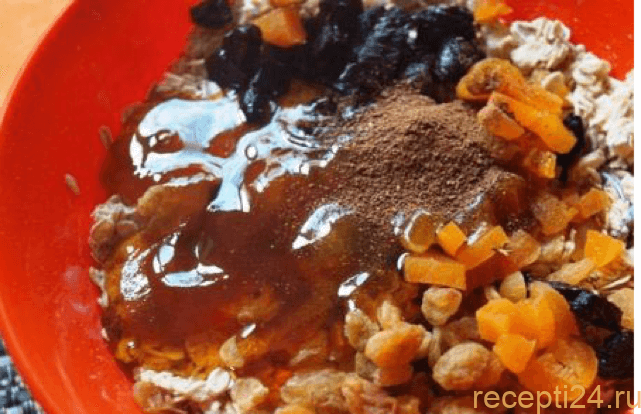 Когда хлопья набухнут, добавить корицу, ванилин, мёд, измельченные орешки и сухофрукты. Тщательно всё перемешать.