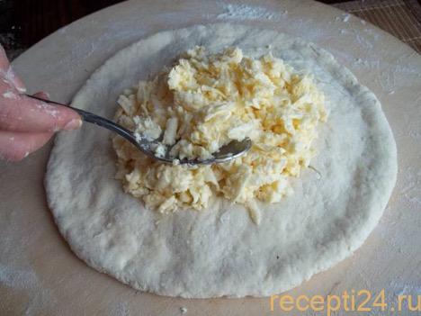 Получившуюся лепешку смазываем взбитым сырым яйцом, присыпаем натертым сыром. Так же поступаем с остальным тестом и начинкой. Выпекаем лепешки в духовке при температуре 220 С в течение 20 минут.