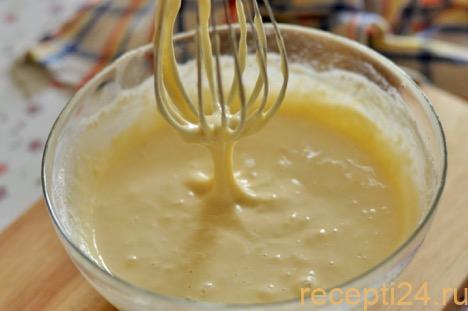 Вливаем молоко в мучную смесь и перемешиваем до однородности, чтобы не оставалось комочков.