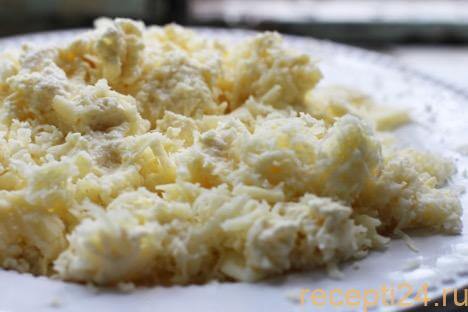 Пока займемся начинкой. Много времени это не займет. Натираем на крупной терке и смешиваем два вида сыра. Небольшую часть сыра (примерно 4 ст. ложки) откладываем в сторону. Она пойдет на посыпку хачапури.