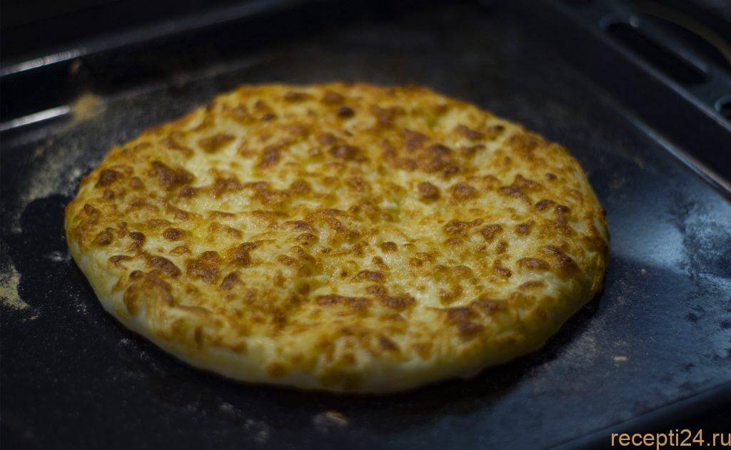 Незадолго до окончания готовки верх лепешки посыпают сыром и дают ему расплавиться.