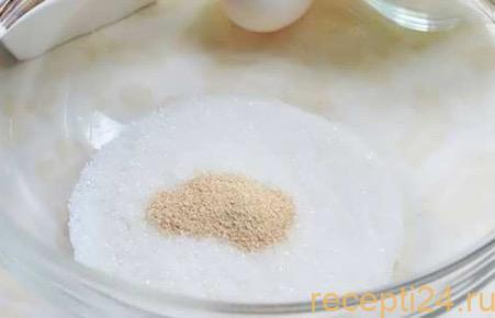 Делаем опару. Смешиваем 1 ч.ложку дрожжей с 1 ст. ложкой сахара, добавляем 200 мл теплой воды.