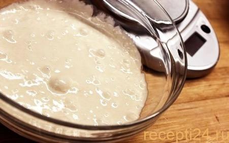 Добавляем в дрожжевую жидкость 5 столовых ложек муки. Смесь должна быть похожа на сметану.