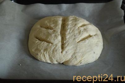 Выкладывать тесто не обязательно в готовую форму. Подойдет обычный противень. Главное придать форму готовому блюду. Можно сформировать батон или паляницу. Сделать сверху фигурные надрезы ножом.