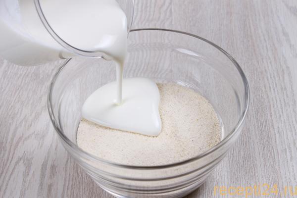 Нужно правильно подготовить манку. Ее размешивают в кефире так, чтобы не было комочков, иначе в духовке она может не пропечься. Оставляют для набухания на час, кефир должен пропитать все крупинки.